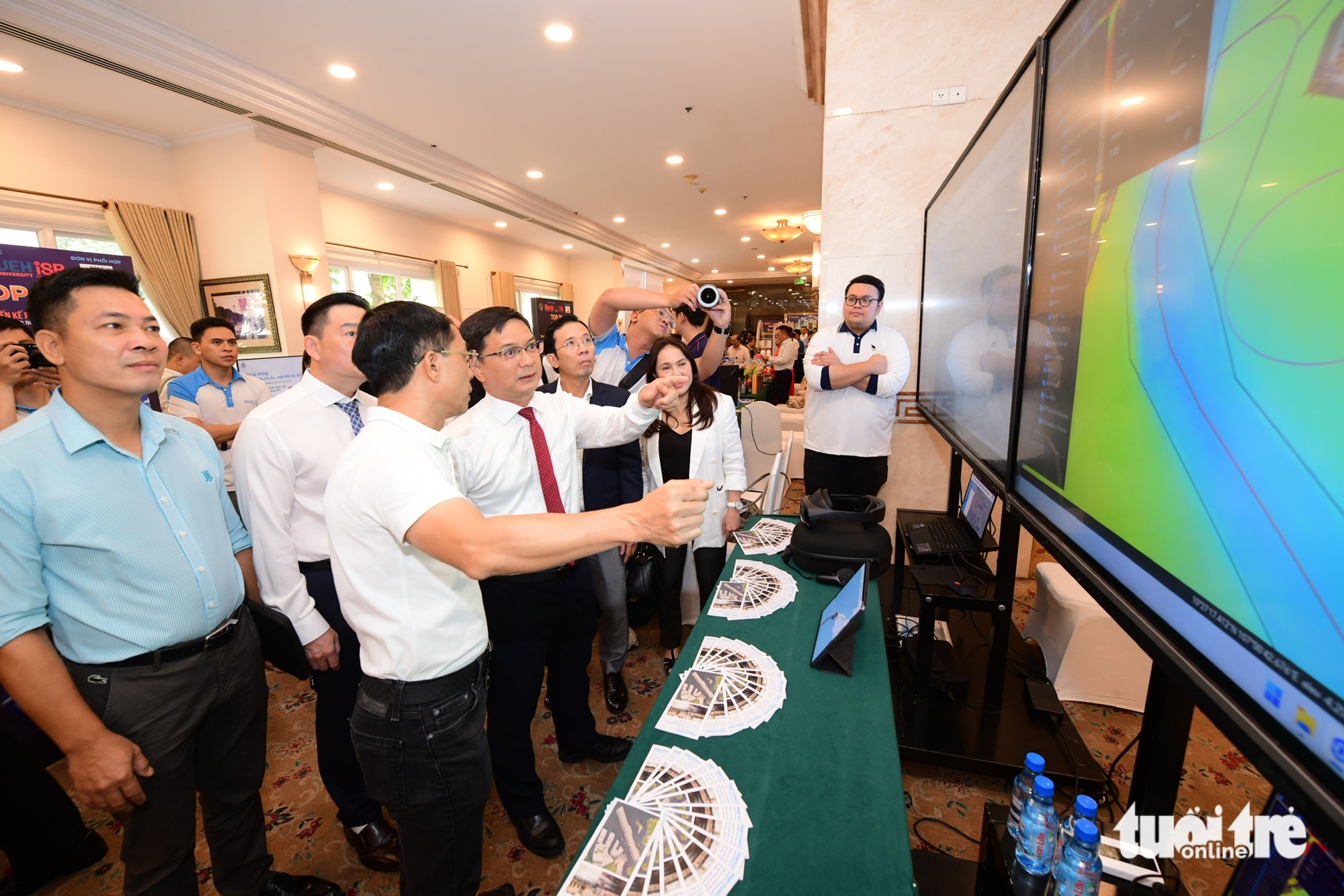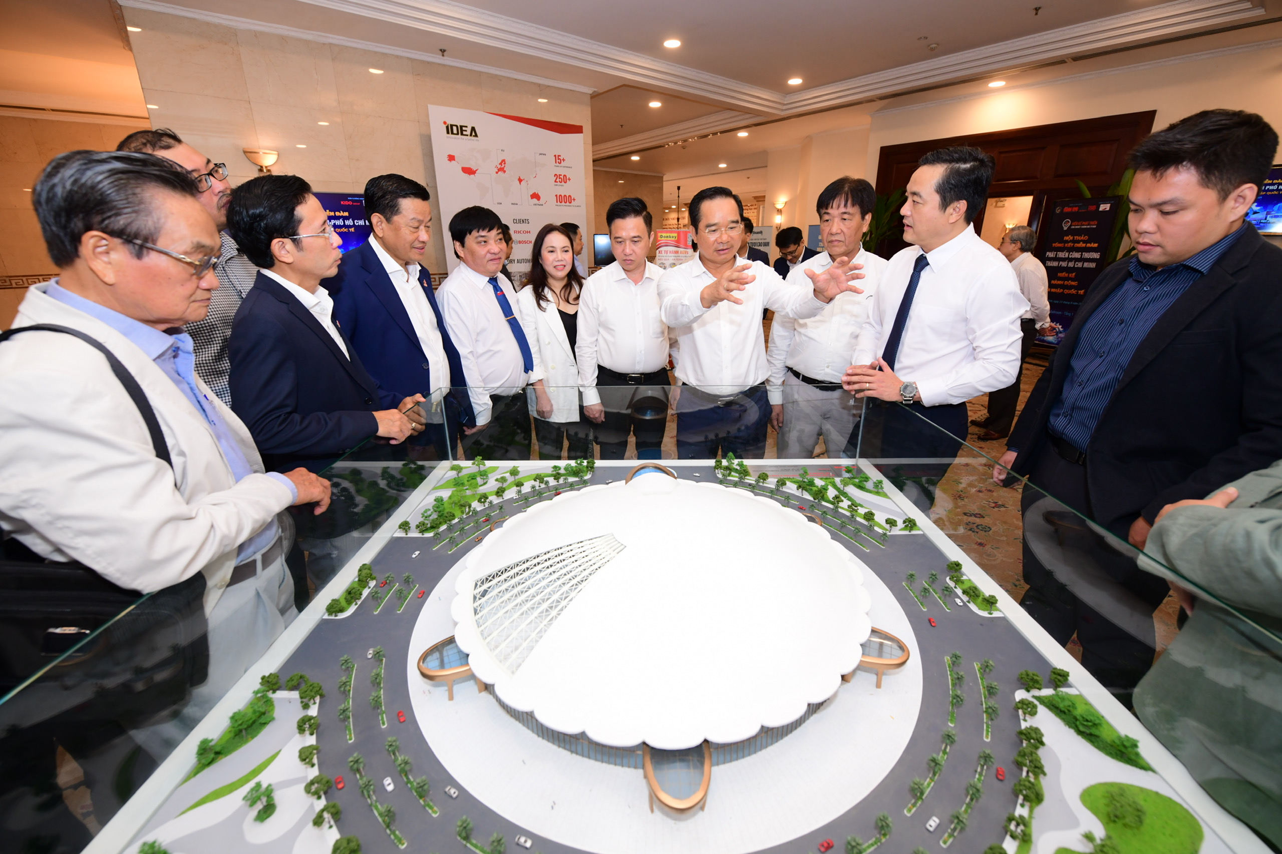 Chủ tịch UBND TP.HCM Nguyễn Văn Được trao đổi với các doanh nghiệp, chuyên gia bên cạnh mô hình công trình triển lãm trong nhà mang hình dáng thần Kim Quy - Ảnh: QUANG ĐỊNH